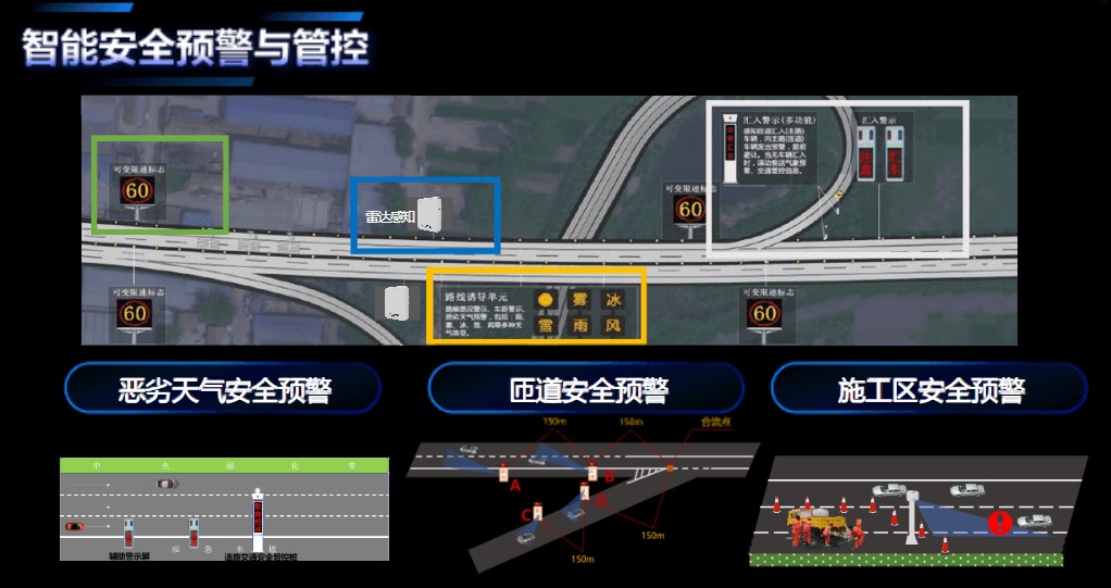 构建“4D雷达感知+气象感知+声光电预警+数字孪生”的综合安全风险预防系统,针对恶劣天气、合流路段等场景消除视野盲区,实时预警,让科技赋能安全,防患未然,实现主动交通协同安全预警,为高速公路安全出行保驾护航。