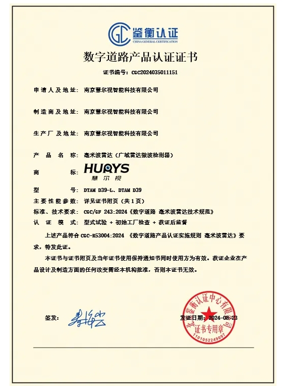 依据《CGC/GF 243:2024 数字道路 毫米波雷达技术规范》,开云电子DTAM D39-L和DTAM D39两款毫米波雷达产品在“智能交通基础设施仿真与实证中心”通过了8大项、31小项的严格测试,获得鉴衡颁发的首张数字道路领域毫米波雷达产品认证证书,证明了开云电子自主研发的毫米波雷达满足数字道路应用场景要求,能够为自动驾驶技术提升和交通安全管理提供数据支撑,为行业树立了新标杆。
